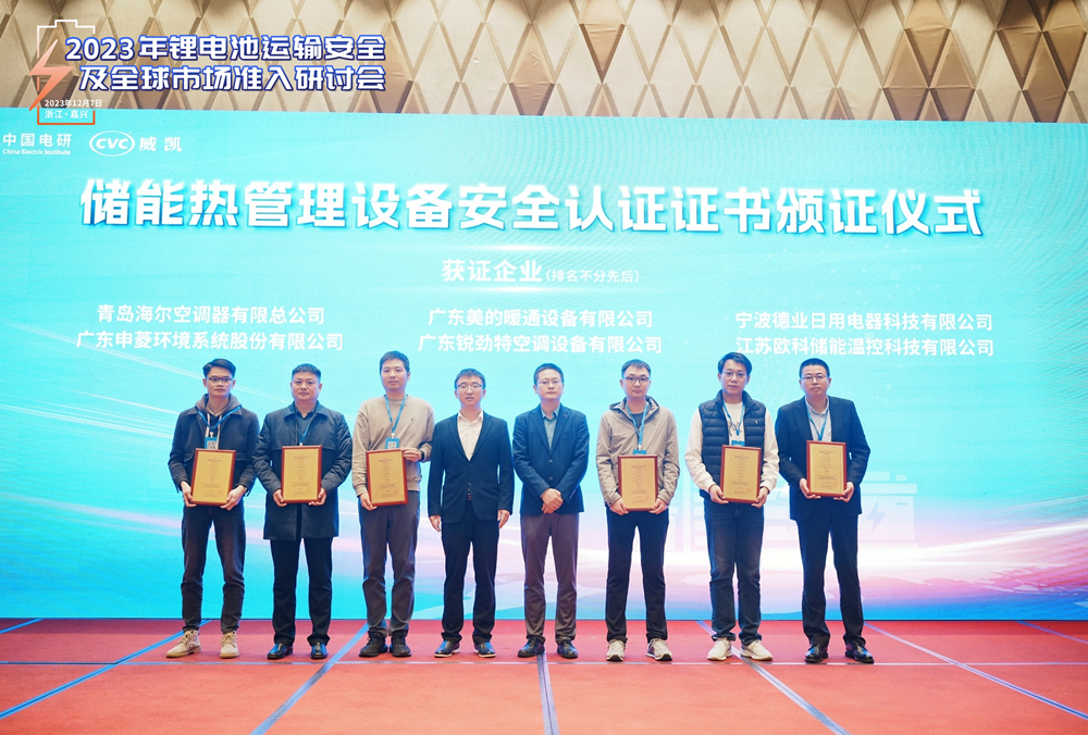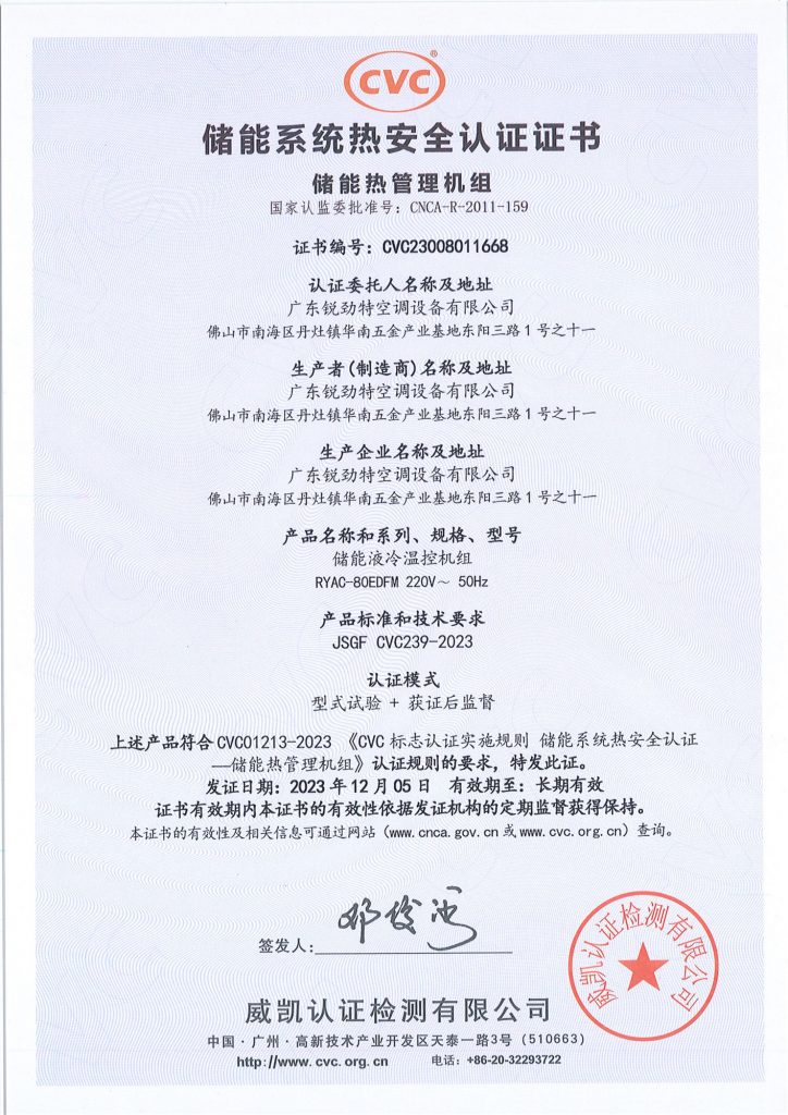 由中國電研CVC威凱主辦的“2023年鋰電池運輸安全及全球市場準入研討會暨首批儲能系統(tǒng)熱安全認證—儲能熱管理機組證書頒證儀式”于12月初,在浙江嘉興順利舉辦。銳勁特受邀出席研討會,并憑借儲能溫控機組榮獲首批儲能系統(tǒng)熱安全認證—儲能熱管理機組證書。